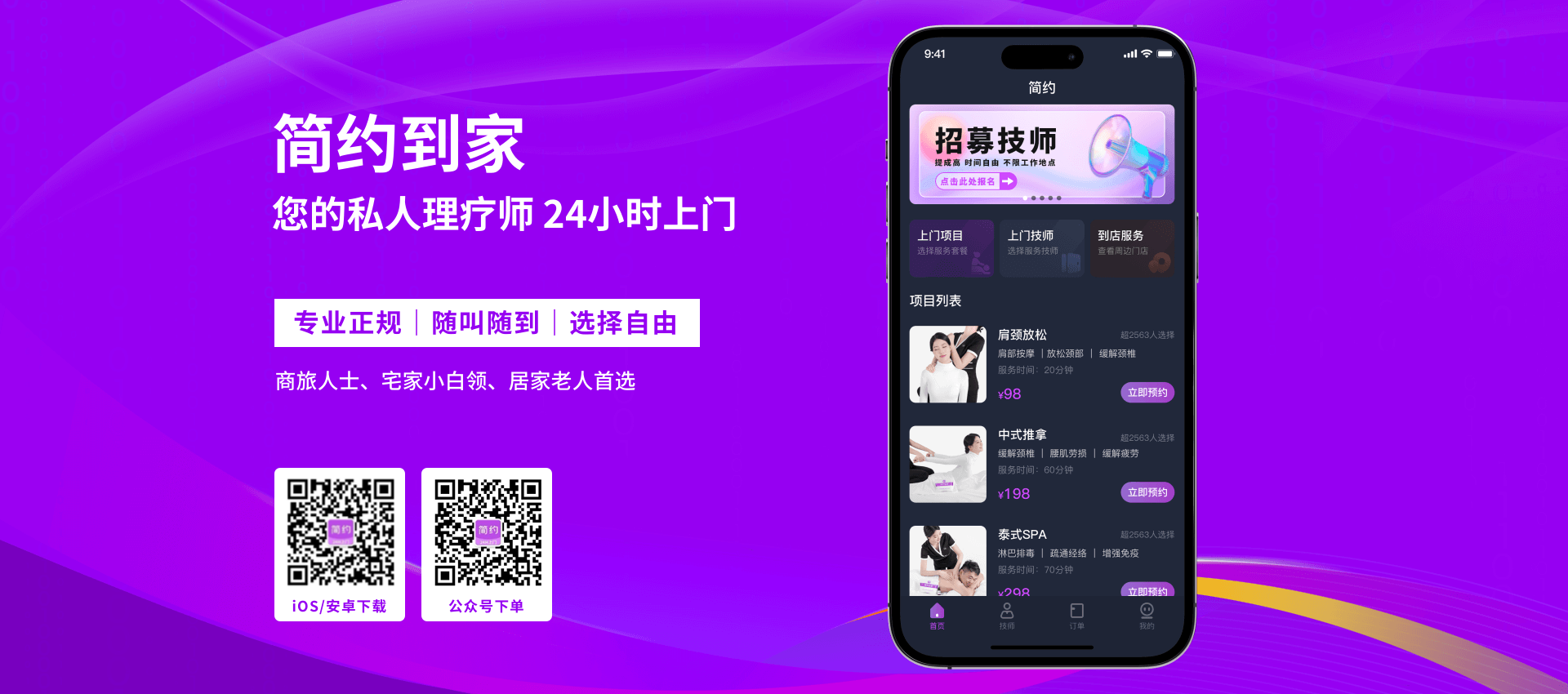 您可通过简约到家APP/微信公众号等渠道预约,可自选项目、技师和上门服务时间。足不出户即可拥有私人理疗师。